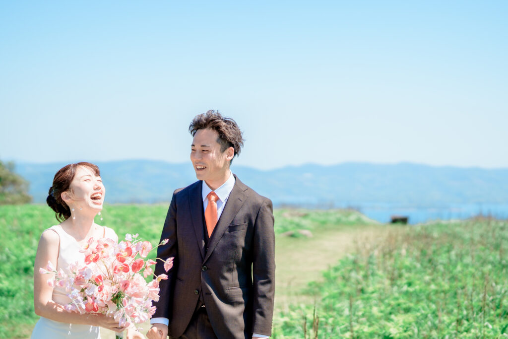 今回の前撮りでは、川内峠、生月島サンセットウェイ、大バエ灯台、この3つのロケーションを巡りました。ひとつの場所に留まらず、景色の変化と一緒に二人の空気感を残せることが大きな魅力です。草原と風が広がる川内峠。海と空が一直線につながる生月島サンセットウェイ。灯台と水平線が印象的な大バエ灯台。それぞれまったく違う表情を持ちながら、共通しているのは、ポーズや演出を作り込まなくても自然な動きだけで写真になること。場所が変わるごとに、表情も、距離感も、空気も少しずつ変わっていき、結果としてその日一日そのものが一つの前撮りストーリーとして残りました。平戸は特別なことをしなくてもちゃんと特別になる、そんな前撮りが叶う場所です。