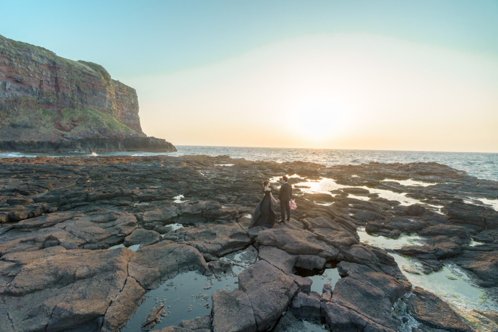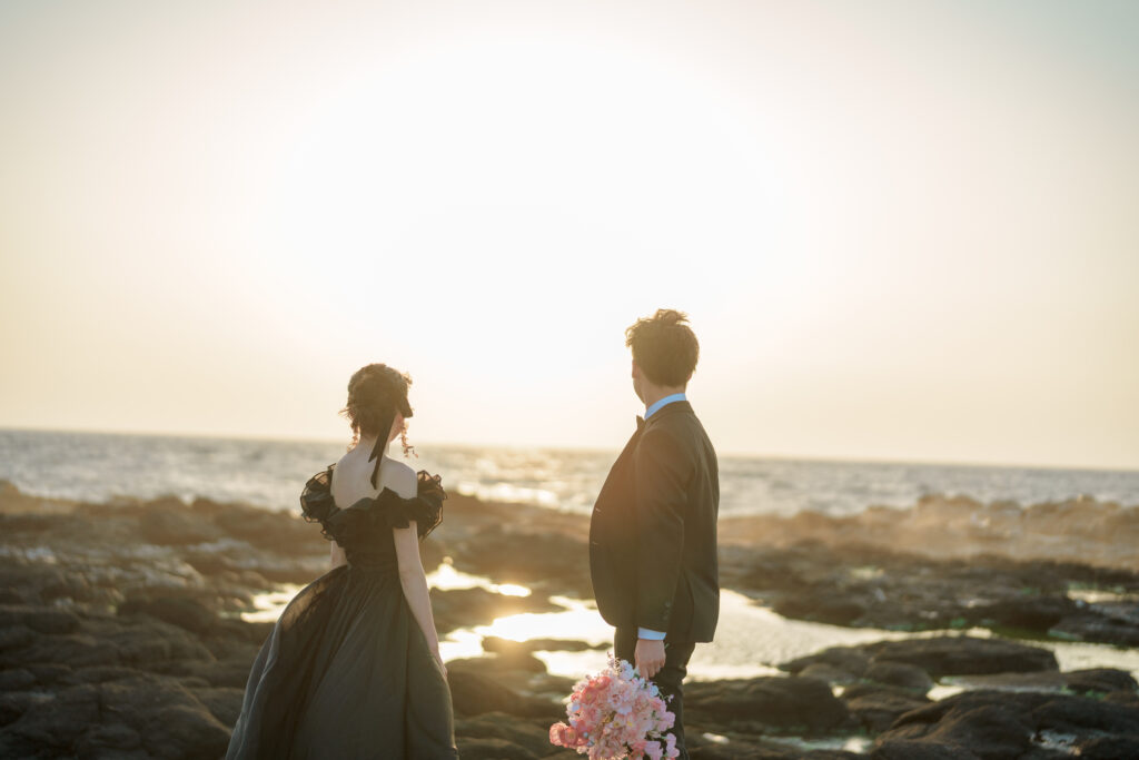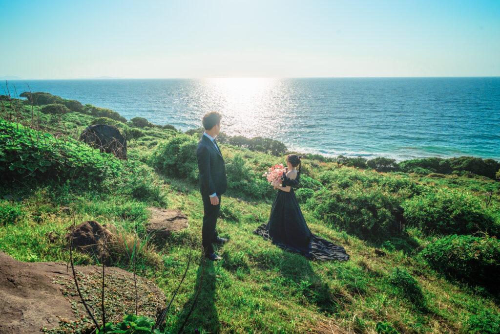川内峠の静かな草原。生月島サンセットウェイの抜けるような海。大バエ灯台の夕暮れの光。どの場所も、二人が主役でありながら、景色に溶け込めるロケーションです。