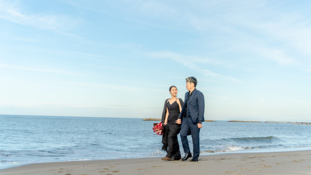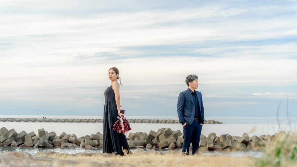 車から少し離れて、海辺での撮影。ただし、背景には必ず2台の車が映り込むように構図を工夫しました。「車がない写真より、車と一緒の写真の方が二人らしい」というお二人の希望を大切に。