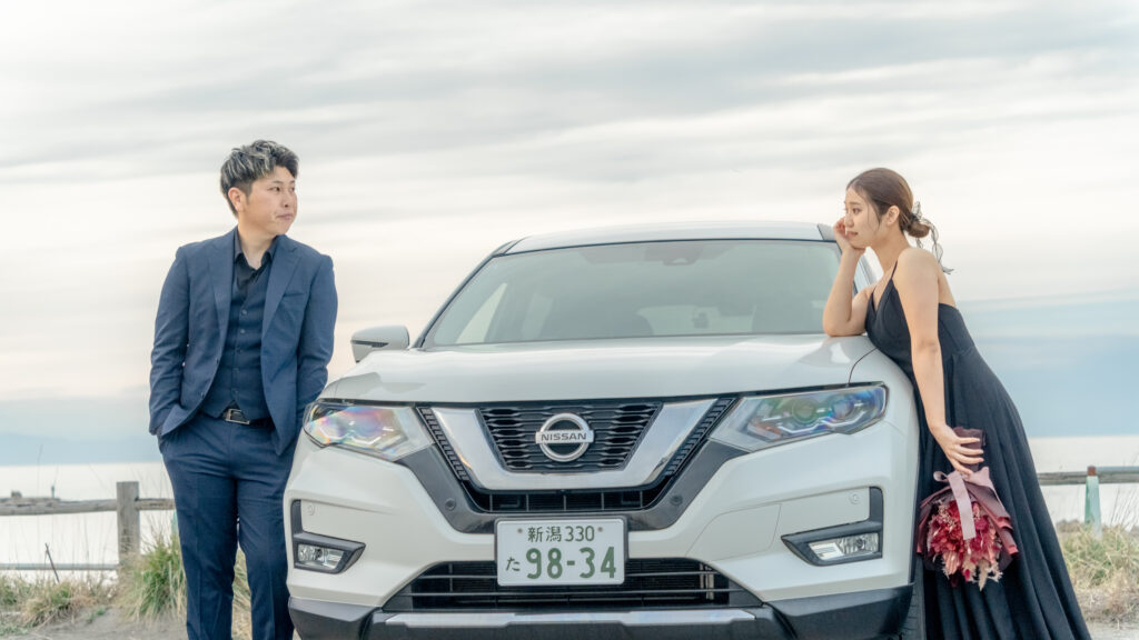 結論から言うと、前撮りは「ドレスを着て綺麗な場所で撮る」だけではありません。二人が大切にしている趣味やライフスタイルを撮影に取り入れることで、何年経っても色褪せない、本当に二人らしい写真が残せます。今回は車が大好きなお二人のために、それぞれの愛車2台と一緒に、新潟の小針浜で撮影を行いました。海辺のドライブ、並んで停めた2台の車、笑いながら車を磨く姿——まるで休日のデートをそのまま切り取ったような、楽しくて明るい作品が完成しました。