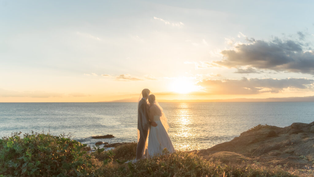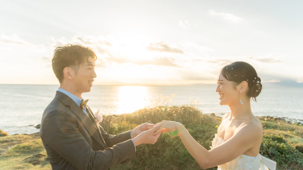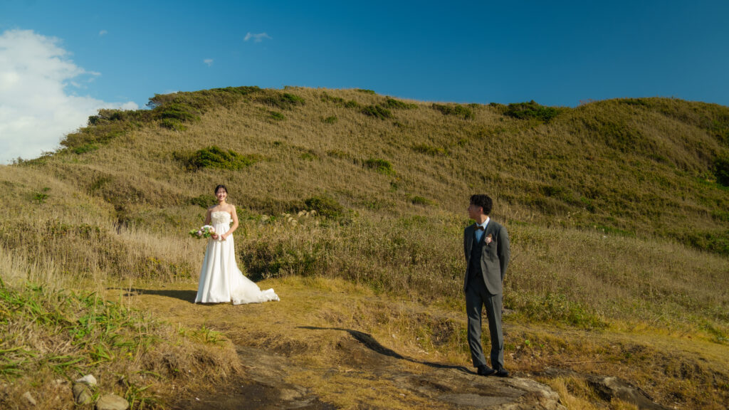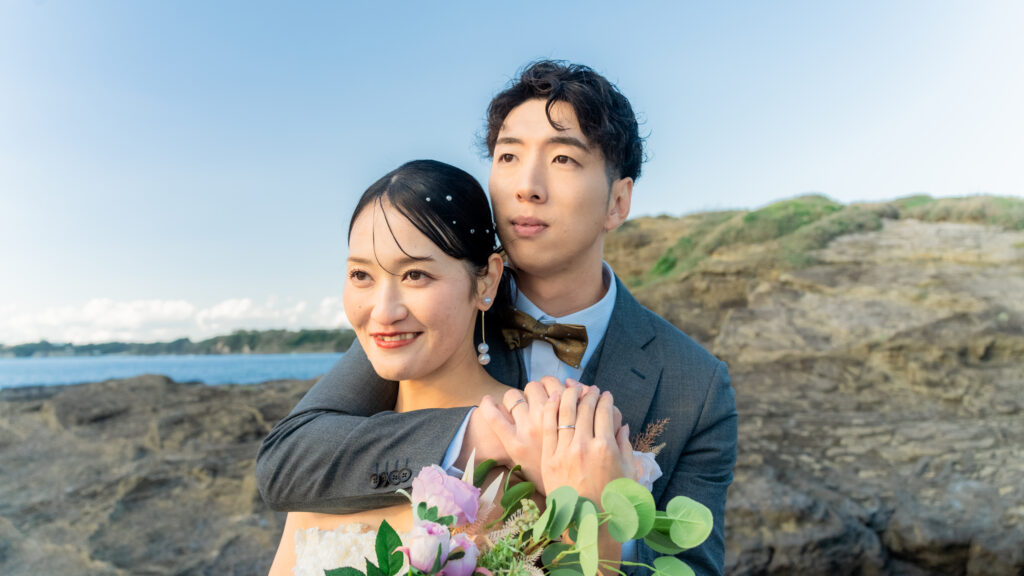 結論から言うと、前撮りは絶景スポットや有名観光地でなくても、二人がいつも訪れる場所、いつも過ごす時間を撮る方が、何年経っても色褪せない記憶になることがあります。神奈川県三浦半島にある黒崎の鼻は、地元の人が散歩に訪れる穏やかな海辺で、観光地のような華やかさはありません。でもだからこそ、「いつものデート」「いつもの休日」をそのまま切り取ることができます。今回は「特別な撮影じゃなくて、いつもの二人を残したい」というお二人のために、黒崎の鼻で夕方の柔らかい光の中、リラックスして過ごす姿を撮影しました。