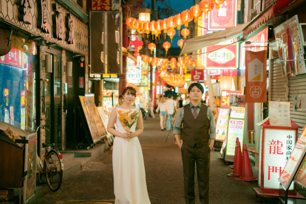 ポイント:夜景撮影では、光のボケ(玉ボケ)が美しい演出になります。背景のネオンや提灯をぼかすことで、二人が浮き上がるような構図が完成します。