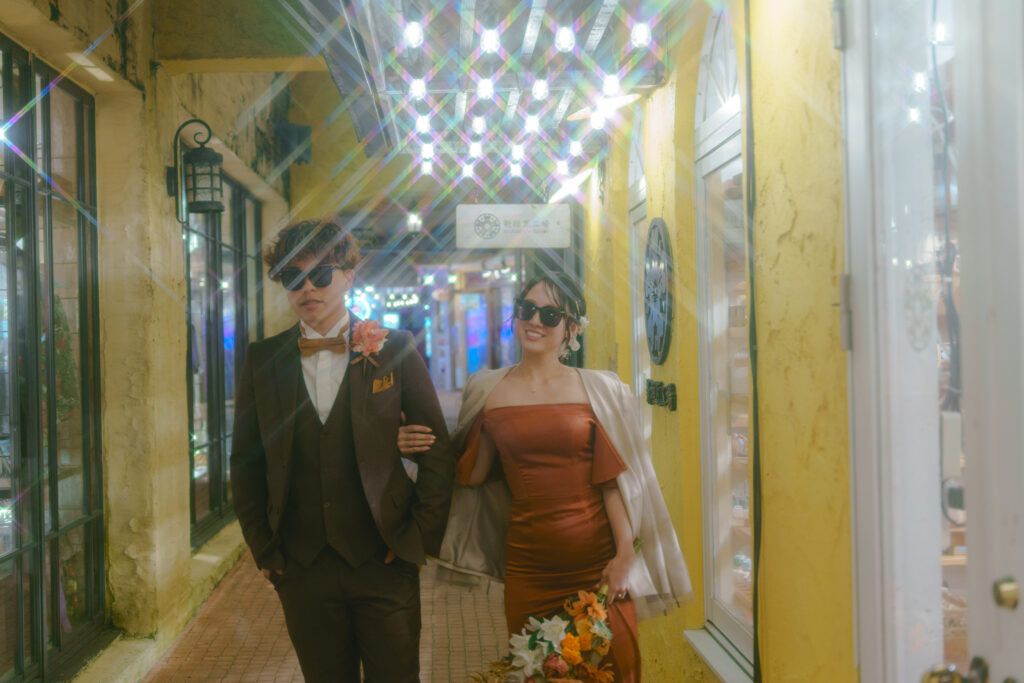 結論から言うと、沖縄・北谷町にある美浜アメリカンビレッジは、カラフルなアメリカンスタイルの建物とネオンサインが立ち並ぶ、日本とは思えない異国情緒溢れるエリアです。特に夜になると、ネオンが輝き、まるでアメリカ西海岸にいるような非日常感に包まれます。今回は「楽しくて明るい雰囲気の写真が撮りたい」というお二人のために、アメリカンビレッジの象徴であるA&Wでハンバーガーを食べながら、カジュアルで楽しいナイト撮影を行いました。観覧車のライトアップ、ビビッドなネオンサイン、そしてルートビア片手に笑い合う二人——まるでアメリカ映画のワンシーンのような、ポップで明るい作品が完成しました。