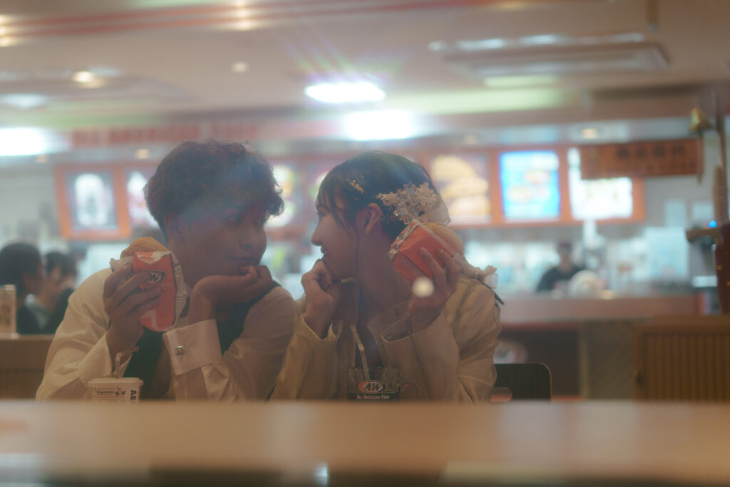 実際にハンバーガーやルートビアを注文し、いつものデート風景をそのまま撮影 - カラフルなネオンを背景に