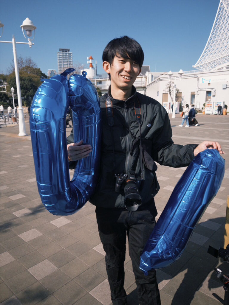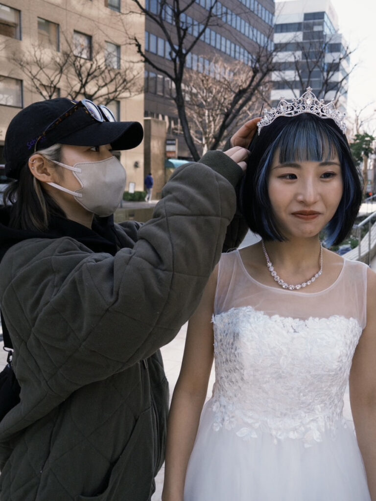 土曜日で人出の多い中でも、背景に人ができるだけ写り込まないよう、立ち位置や画角を細かく調整しながら撮影しました。